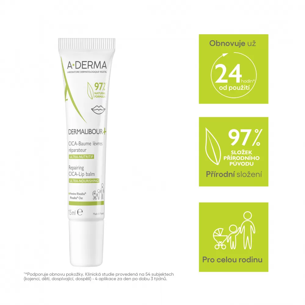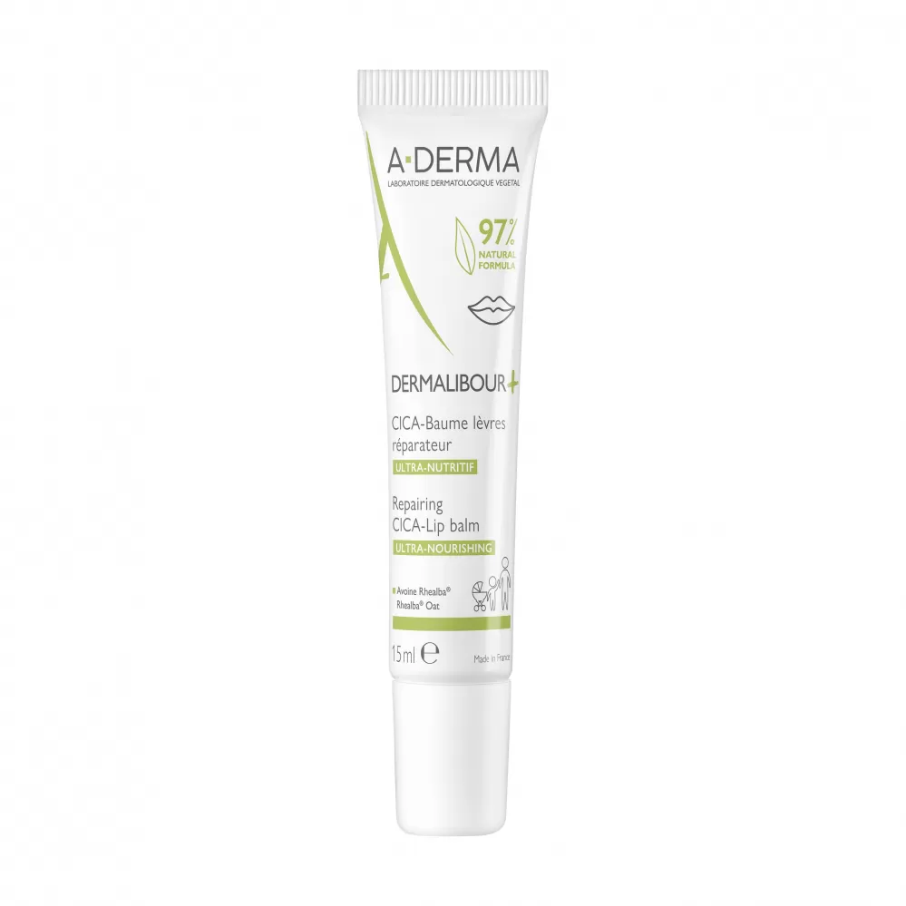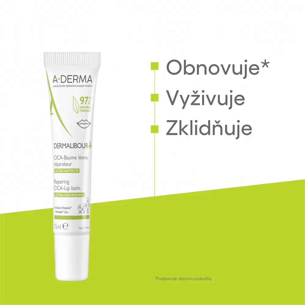 DERMALIBOUR+ Reparační CICA-Balzám na rty zklidňuje, obnovuje* do 24 hod¹ a vyživuje podrážděné, popraskané a velmi suché rty. Rty znovu získají pohodlí a hebkost od první aplikace. Obsahuje výtažek z ovsa Rhealba®, rostlinné oleje a másla (jojobový, bambucký, slunečnicový). Díky 97 % přírodních ingrediencí balzám okamžitě zklidňuje pocity pnutí rtů. Díky praktické velikosti jej můžete vzít všude sebou. Obsahuje také čistící minerální látky (síran zinečnatý, který omezuje množení bakterií). Nabízí vysokou voděodolnost, dlouhotrvající 48 hod³ ochranu a okamžité zklidňující účinky. Rychle se vstřebává, zanechává na rtech ochranný film bez bílých stop. Dermatologicky a pediatricky testováno, je vhodný pro celou rodinu. Neobsahuje parfemaci ani minerální oleje.