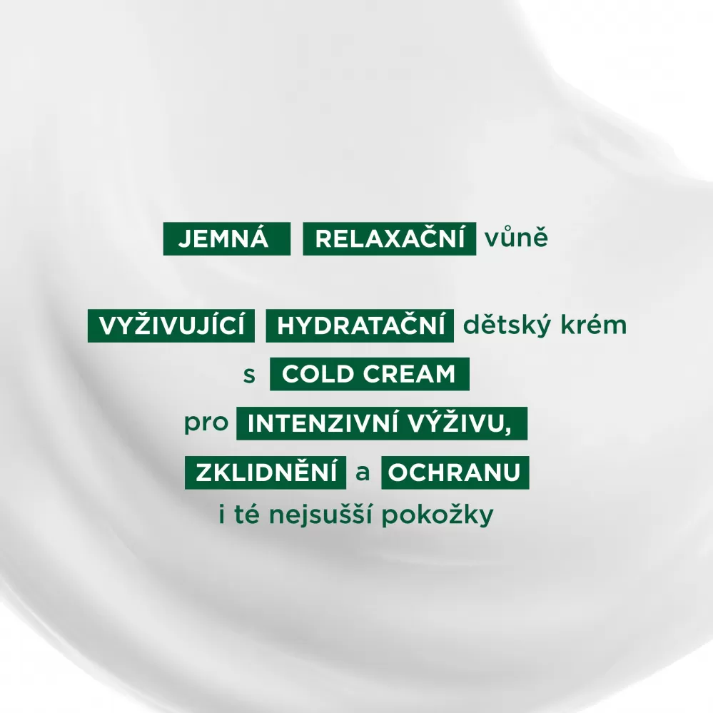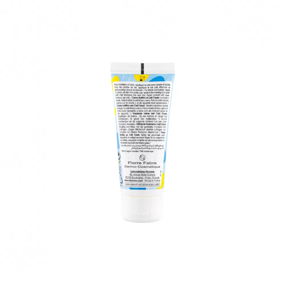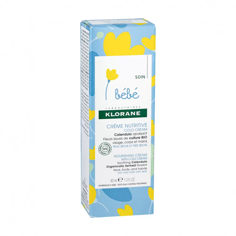 Výživný krém pro suchou pleť s cold cream a výtažkem z měsíčku obsahuje vysoce hydratační a emolienční vazelinovo-glycerinový komplex, který obnovuje rovnováhu ochranného hydrolipidického filmu suché pokožky. Ochranná bariéra, kterou vytváří cold cream, chrání pleť před agresivními vnějšími vlivy (chlad, vítr). Zklidňující a protidráždivé vlastnosti výtažku z měsíčku navrací suché a podrážděné pleti příjemný pocit. Dětský Výživný krém Klorane s Cold Cream intenzivně vyživuje, zklidňuje a chrání suchou pokožku již od narození. Krémové složení se složkami přírodního původu* spojuje květy BIO měsíčku, kartmový olej obnovující lipidy a výživný Cold Cream, který hloubkově chrání a hydratuje citlivou pokožku. Sametová nelepivá textura byla testována pod dohledem pediatrů** a přípravek je možné použít i na mléčné krusty. Dětská pokožka je zklidněná, respektovaná a intenzivně vyživená***. Přípravek zanechává relaxační květinovou vůni.