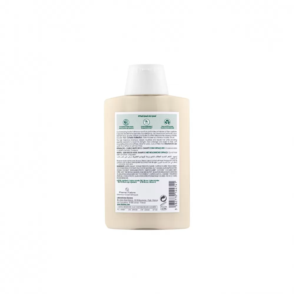 Obnova a výživa pro velmi suché a poškozené vlasy. KLORANE Šampon s BIO máslem Cupuacu obsahuje 83 % přírodních složek a máslo z jader cupuaçu, které vyživuje vlasové vlákno do hloubky a uhlazuje povrch vlasu. Vlasy jsou po umytí pružné, hebké a snadno se rozčesávají. Šampon dodává vlasům zdravý lesk a je ideální pro vlnité a kudrnaté nebo krepaté vlasy.