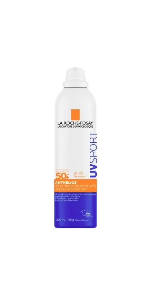 LA ROCHE-POSAY ANTHELIOS UV SPORT ochranná osvěžující mlha SPF50+ VELMI VYSOKÁ UVB/UVA OCHRANA. OSVĚŽUJÍCÍ A TRANSPARENTNÍ. ODOLNÉ VODĚ, POTU A PÍSKU.