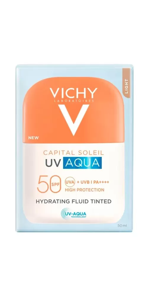 VICHY CAPITAL SOLEIL UV AQUA neviditelný hydratační fluid SPF50 - TÓNOVANÝ LIGHT svěží jako voda  s UV-AQUA technologií.