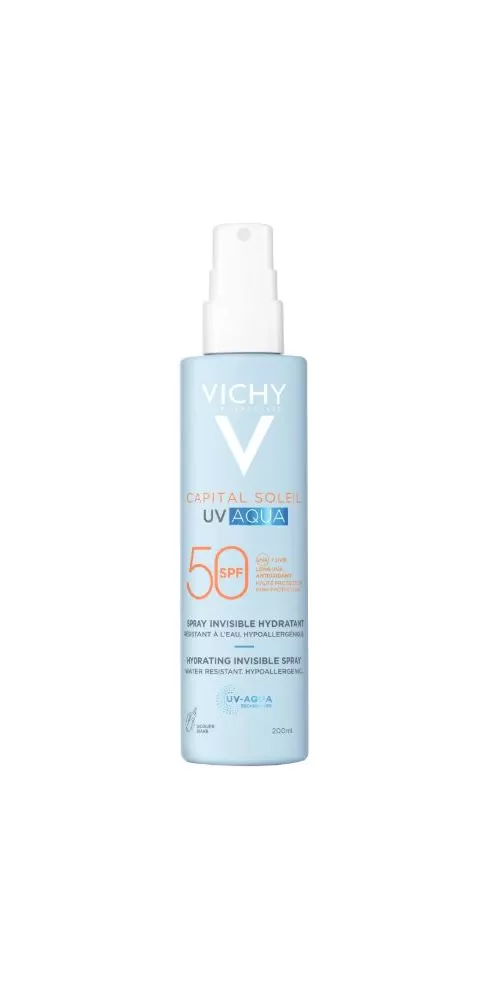 VICHY CAPITAL SOLEIL UV AQUA ochranný a hydratační sprej SPF50 na tvář a tělo obohacený o beta-karoten.  Pokročilá ochrana UVB+UVA+DLOUHÉ UVA. UV-Aqua technologie: hydratační, svěží a neviditelná - jako voda. Obohacena o beta-karoten, který pomáhá zvýraznit opálení. Testováno pod dermatologickou a oftalmologickou kontrolou.