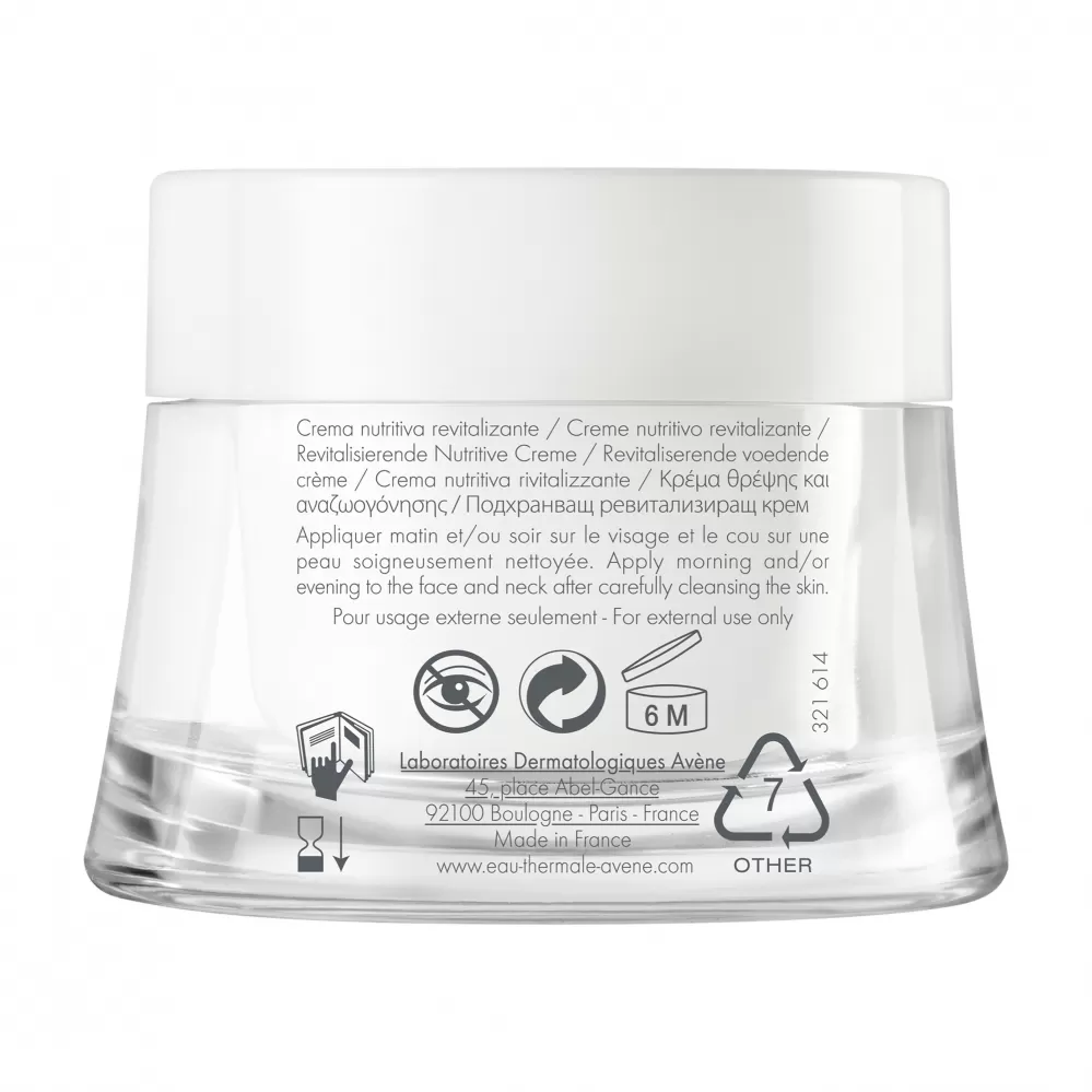 Tato jemná vyživující péče působí na známky únavy (povadlé rysy a mdlá pleť) a zklidňuje nepříjemné pocity pleti, které chybí výživa, díky vyživujícím látkám se strukturou homologickou k mezibuněčné hmotě v kombinaci se zjemňujícími a zvláčňujícími oleji. Tento revitalizační výživný krém zklidňuje a chrání suchou a unavenou pleť. Složení tohoto výživného krému obsahuje přírodní extrakt z červeného ovoce, „posilovač“ kožních buněk a stabilní formu antioxidačního vitaminu E, který účinně bojuje proti známkám únavy, a také zklidňující a zjemňující termální vodu Avène. Jeho textura zanechává na pokožce jemný nemastný závoj, který odhaluje její přirozenou krásu. Suché pleti se navrací pružnost a komfort a pleť je zářivá.