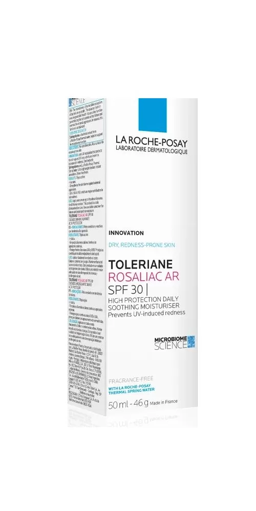 LA ROCHE-POSAY TOLERIANE ROSALIAC AR SPF30 zklidňující hydratační krém bez parfemace pro suchou a citlivou pleť. Vhodné i pro pleť se sklonem k resacei/růžovce. INOVACE: Hydratační krém s anti-UV ochranou, který pomáhá chránit pokožku proti UV záření, o kterém je známo, že zvyšuje zarudnutí pokožky. Obohaceno o Sphingobiom a  termální pramenitou vodu La Roche-Posay. Ultra lehká textura. Okamžitá absorpce. Matný finish bez lesku.