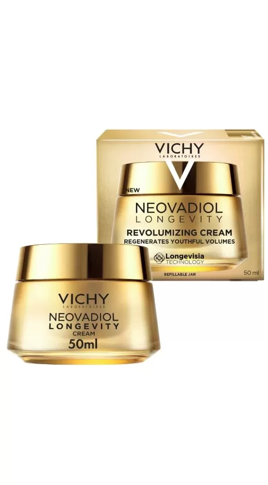 VICHY NEOVADIOL LONGEVITY revitalizační krém s obsahem 13% Proxylane-Longevity Technology™ [Proxylane + Niacinamid + Senevisium®]. Průlomová technologie dlouhověkosti podložená více než 20 lety výzkumu: Obnovení vlastní schopnost pokožky regenerovat +31 % mladistvé epidermální tkáně.