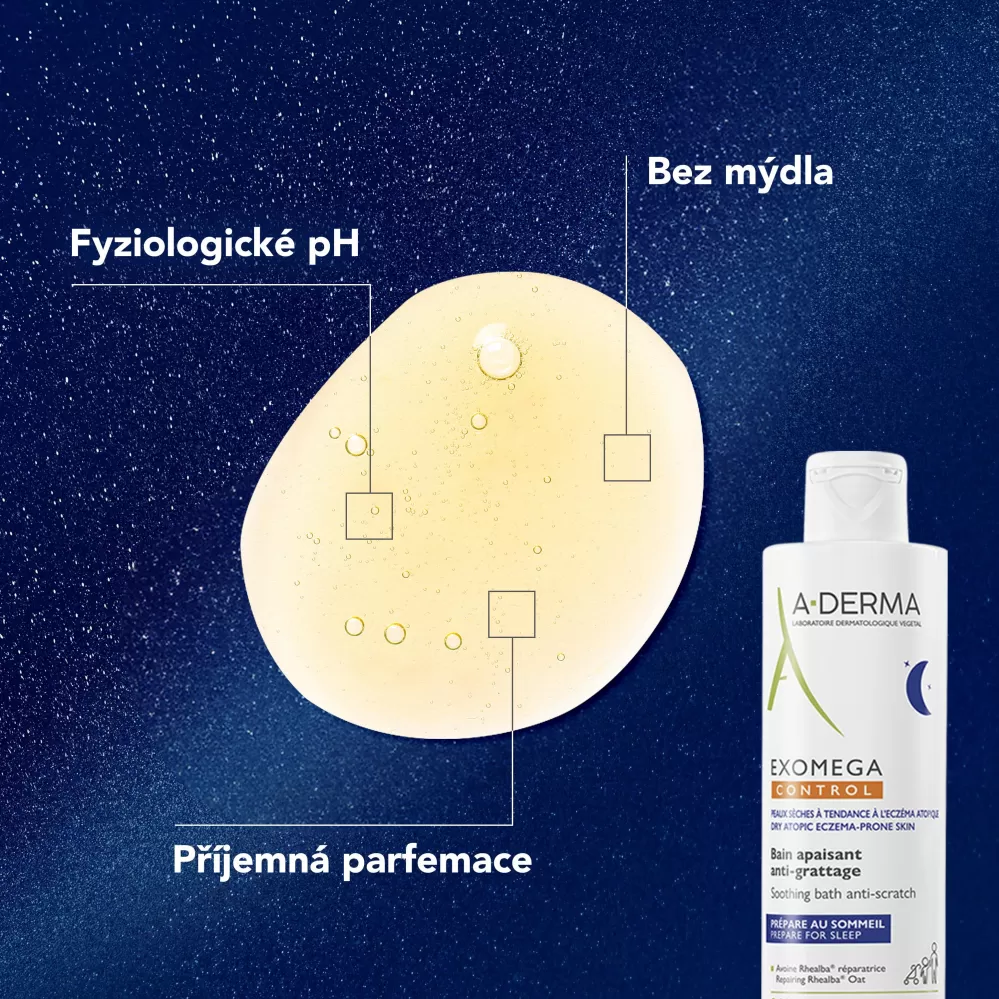 A-DERMA Exomega CONTROL je zklidňující koupelový přípravek navržený pro zmírnění svědění a podráždění suché pokožky se sklonem k atopickému ekzému. Tento přírodní produkt využívá sílu výtažku z plántulí Avena Rhealba® k dosažení okamžitého zklidnění a hydratace. Složení je obohaceno o Filaxerine®, vitamín B3 a glycerin, které společně přispívají k obnově a zjemnění pokožky. Produkt je vhodný pro děti od šesti měsíců a je vyroben z 96% přírodních složek, což zajišťuje šetrnost k pokožce i životnímu prostředí.