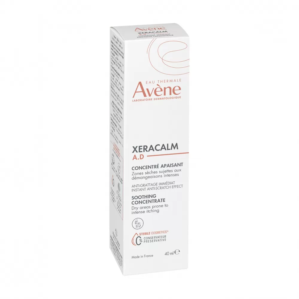 Poznejte záchranu pro náročnou pokožku – Avene Eau Thermale XeraCalm A.D Zklidňující koncentrát, vytvořený pro každodenní péči o obličej, tělo u osob s atopickou dermatitidou, velmi suchou, svědivou a podrážděnou pokožkou.