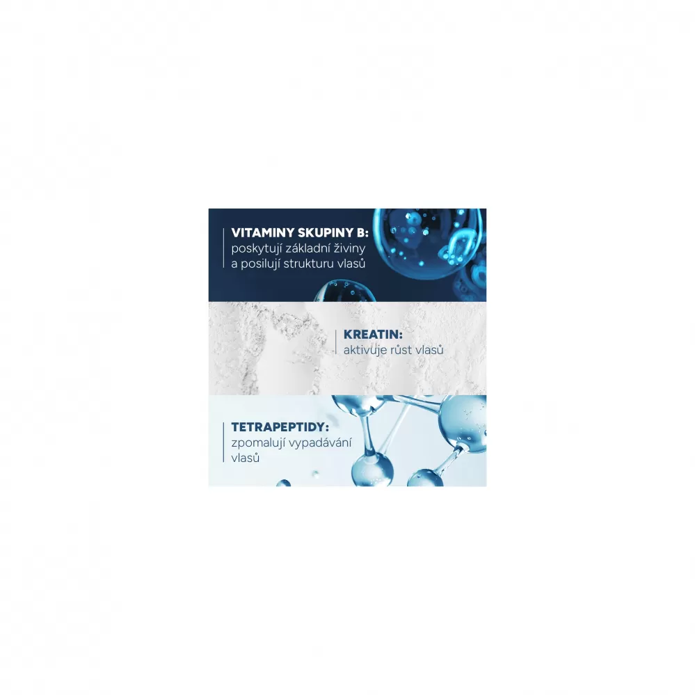 • komplex vitamínů B5, B6 a B8 vyživuje vlasovou cibulku a podporuje tak keratinizaci vlasů