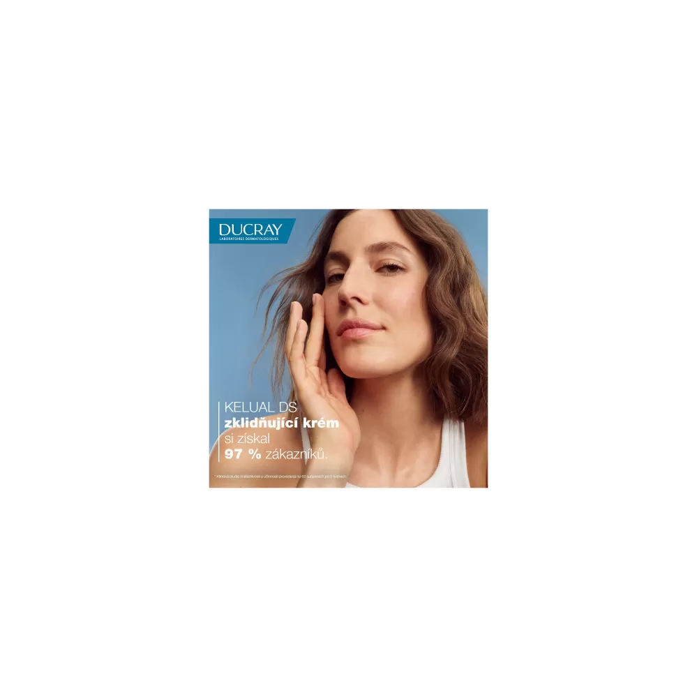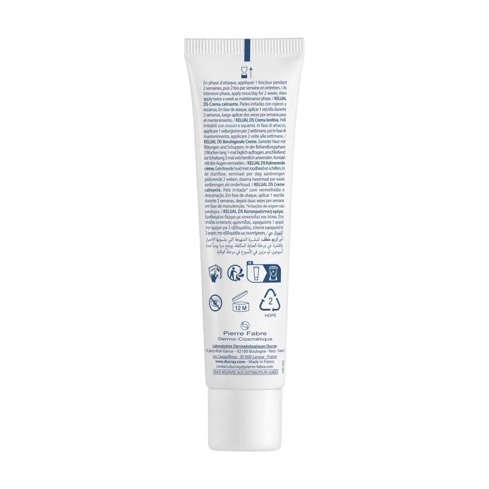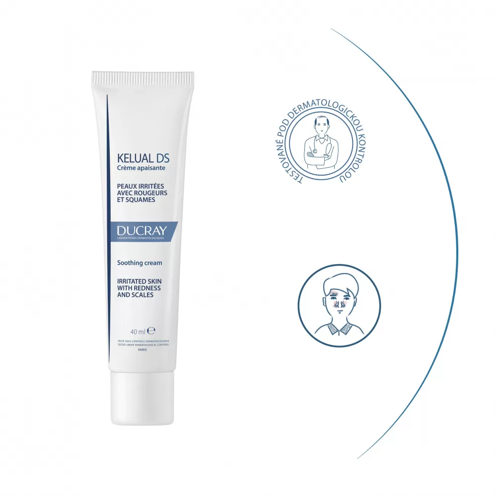 Léčebný krém Kelual DS je určený pro podrážděnou pokožku s lokalizovaným zarudnutím a s nadměrným olupováním na mastných zónách obličeje, na bočních částech nosu, na obočí a v oblasti vlasové kontury.