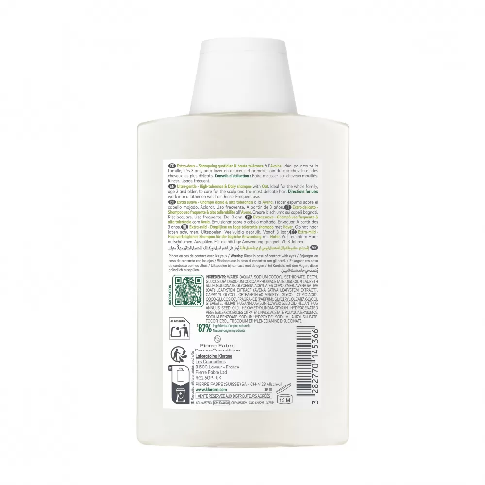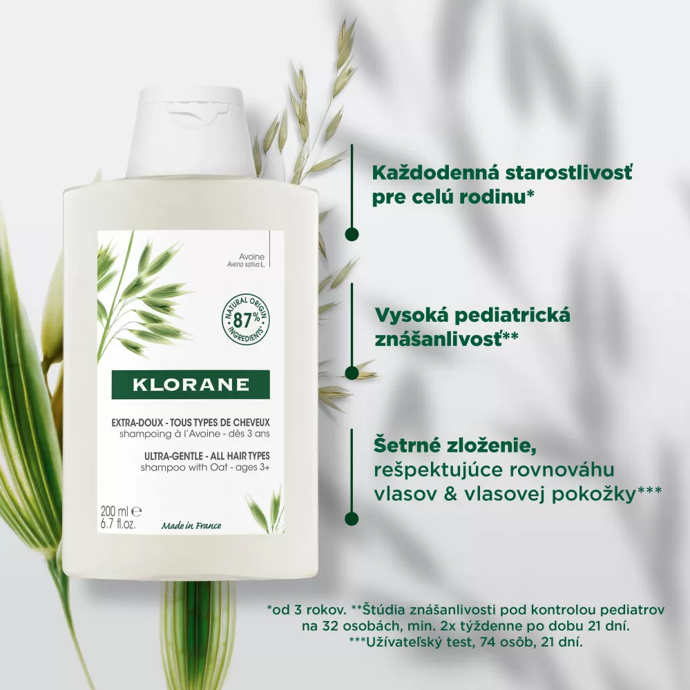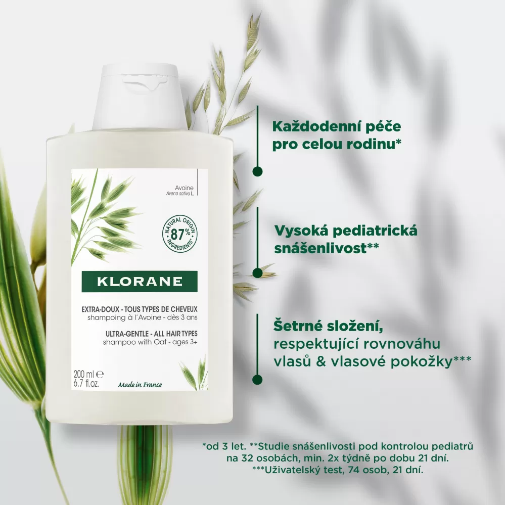 Klorane Shampooing Extra-doux au lait d´avoine - velmi jemný šampon s ovesným mlékem. K dennímu použití. Šampon s ovesným mlékem je určen pro každodenní mytí vlasů, navrací jim hebkost, jas a krásu. Mléko získané z ovsa zároveň zklidňuje a vyživuje vlasovou pokožku. Šampon s BIO ovsem myje, zjemňuje a chrání pokožku hlavy a vlasy celé rodiny včetně dětí od 3 let. Jeho bioodbouratelné složení* s vysokou snášenlivostí obsahuje 87% složek přírodního původu. Dermatologicky a pediatricky testovaný šampon respektuje rovnováhu křehké pokožky celé rodiny, včetně dětí od 3 let. Díky zjemňujícím a ochranným vlastnostem výtažku z ovsa, organicky pěstovaného na jihozápadě Francie, poskytuje vlasům skutečnou lázeň hebkosti a usnadňuje rozčesávání. Vlasy jsou dokonale čisté, pružné a chráněné.
